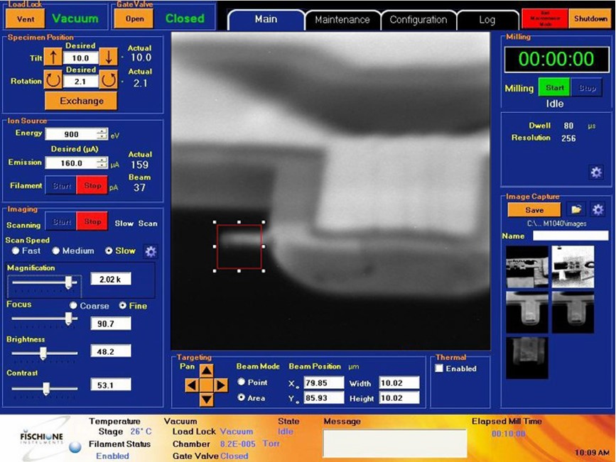Система NanoMill работает с минимальным вмешательством пользователя. Условия обработки, такие как параметры ионного источника, угол травления, положение образца, порог температуры и время обработки, программируются через одно окно. Программное обеспечение позволяет: