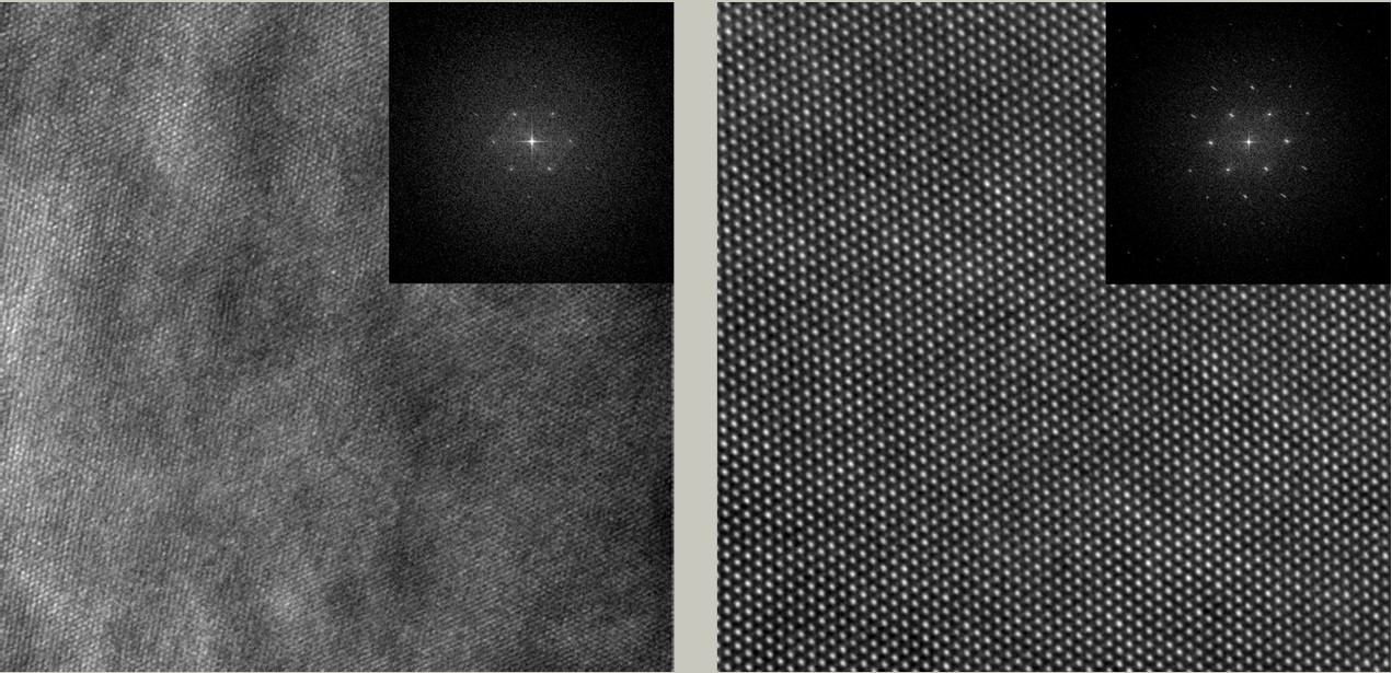 FFT слева (до NanoMilling) показывает расплывчатый ореол, что связано с аморфным повреждением. FFT справа (после NanoMilling) не показывает этого ореола, что указывает на то, что система NanoMill устранила аморфные повреждения.