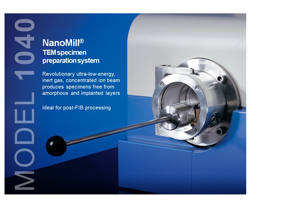 Переменный источник ионов генерирует энергии ионов до 50 эВ. Диаметр пучка может быть всего 1 мкм, что позволяет удалять аморфизацию, имплантацию или повторное осаждение материала с целевых областей. Идеальное применение системы NanoMill — обработка после фокусированного ионного пучка (FIB). Хотя FIB эффективно подготавливает TEM-образцы, его жидкометаллический (Ga) источник часто приводит к аморфизации и внедрению Ga. Повреждённые слои могут достигать толщины 10–30 нм. Система NanoMill идеально подходит для их удаления.