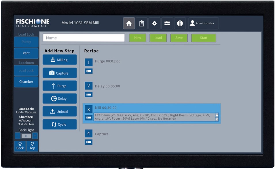 Параметры травления задаются с помощью 10-дюймового сенсорного экрана, который можно физически установить на удобную высоту и под предпочтительным углом обзора. Через сенсорный экран можно управлять широким спектром параметров прибора, таких как энергия ионов, угол травления, движение образца, позиционирование образца и завершение процесса.