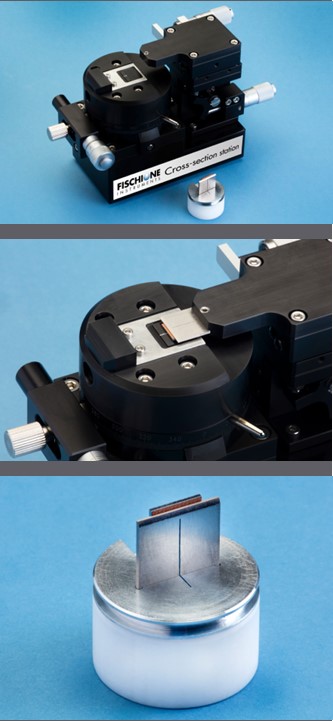 Станция подготовки поперечных сечений Fischione Instruments (сверху) — это дополнительный инструмент для быстрого получения высококачественных поперечных сечений образцов. Станция обеспечивает точное позиционирование области интереса (в центре) по координатам X, Y и θ. Полученный образец поперечного сечения (снизу) готов к ионному фрезерованию в системе Model 1061 SEM Mill.