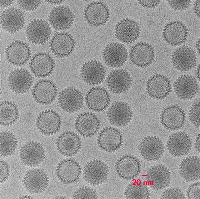 Капсиды имеют икосаэдрическую форму, диаметр — 1250 Å. Образец включает C-капсиды, заполненные ДНК, а также пустые A-капсиды и B-капсиды, которые сохраняют часть каркаса, использованного при их сборке. Фон содержит нити двухцепочечной ДНК (dsDNA), потерянной из некоторых капсидов. Снимок сделан на FEI TF20 TEM (увеличение 50 000× при 200 кэВ, электронная доза ~20–25 e⁻/Ų) с использованием крио-держателя для томографии Model 2550 при -178 °C. Образец подготовлен с помощью FEI Vitrobot Mk III на сетке Quantifoil R2/1.
