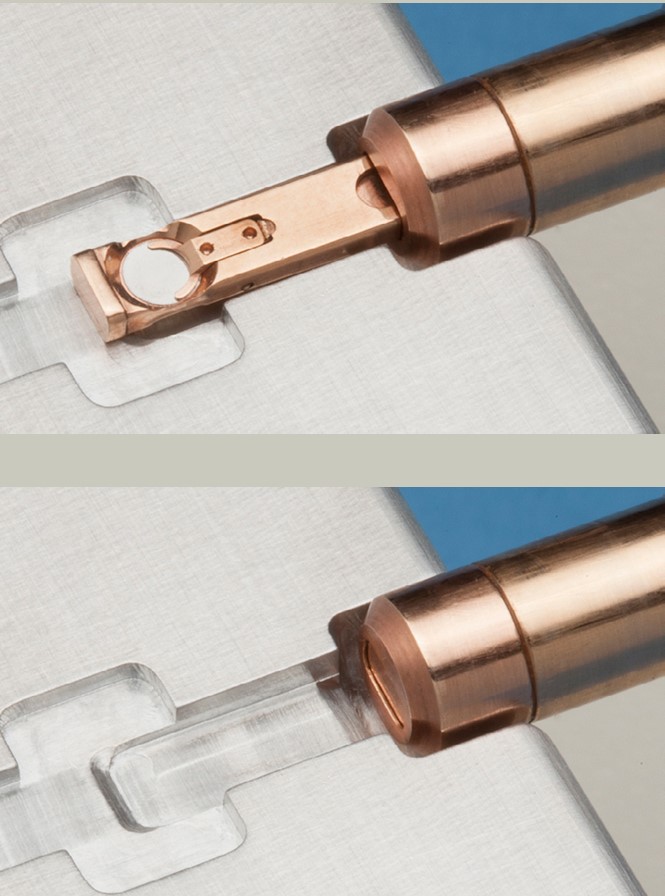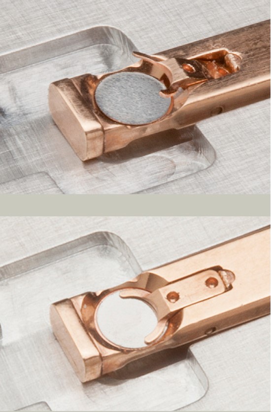 Кончик держателя принимает образец или сетку ТЭМ диаметром 3 мм, который фиксируется пружинным зажимом. При фиксации зажим обеспечивает надежное удержание по краю образца и максимизирует видимость образца, даже при больших углах наклона.